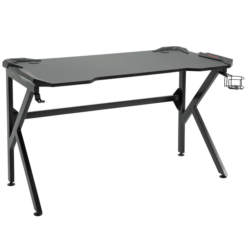 Bureau gaming bureau gamer bureau informatique support casque porte-gobelet passe-câbles inclus métal MDF texture fibre carbone noir