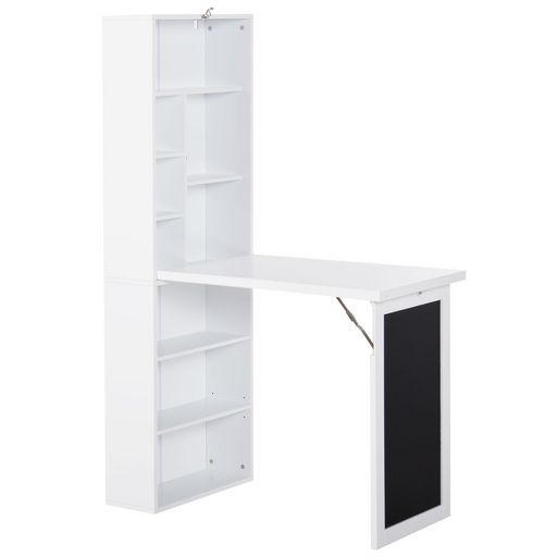 Bureau mural pliable table murale rabattable suspendue sur pied avec bibliothèque tableau à craie intégré panneaux particules blanc