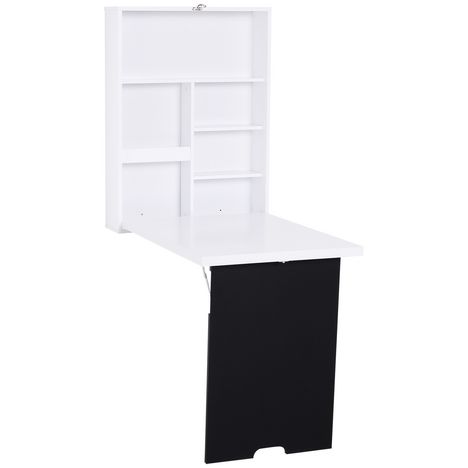 Bureau mural pliable table murale rabattable suspendue sur pied étagère + tableau à craie intégré MDF blanc
