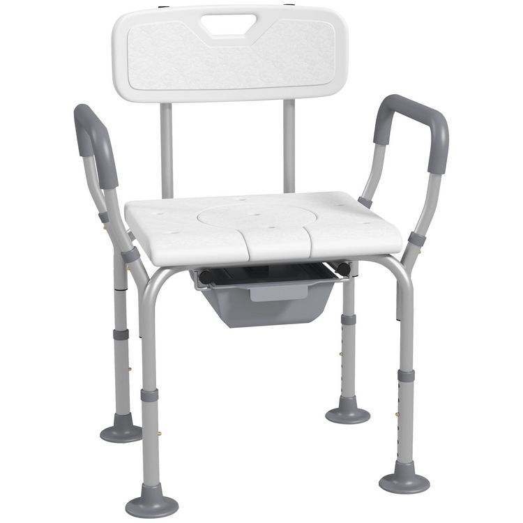Découvrez la chaise de douche HOMCOM, idéale comme chaise pour toilette, siège de bain ou chaise percée. Cadre en aluminium robuste, assise large avec accoudoirs, hauteur réglable de 70 à 82,5 cm. Plateau sous l'assise amovible pour un nettoyage facile.