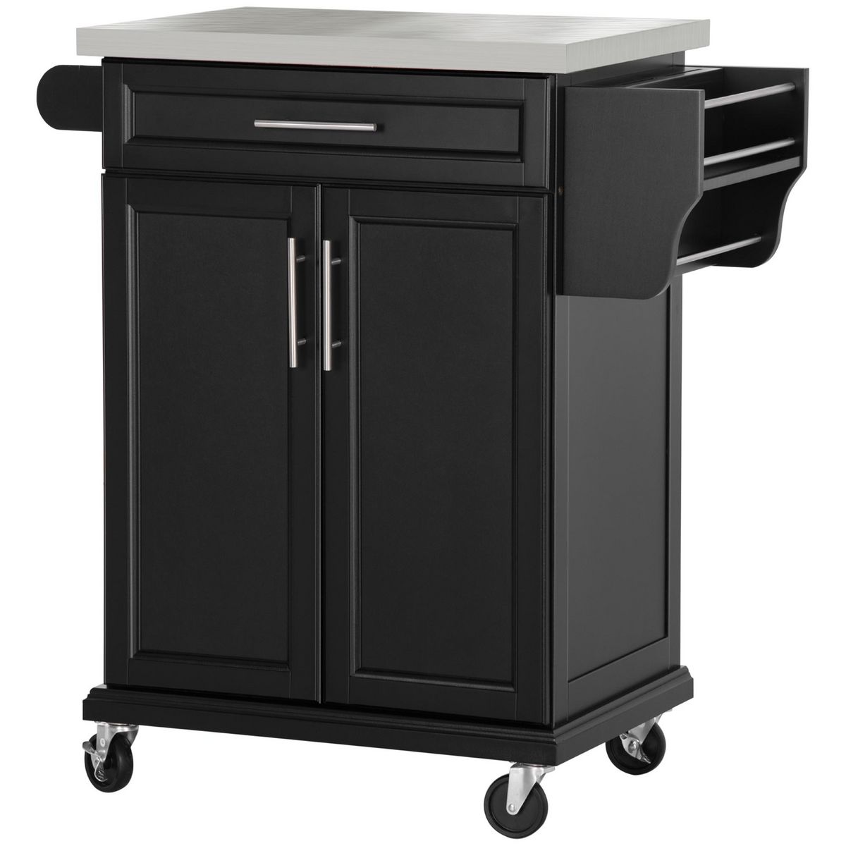 Chariot de service desserte de cuisine à roulettes îlot de cuisine - placard 2 portes, étagères, range couverts et condiments latéral - plateau acier inox. bois noir