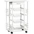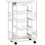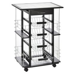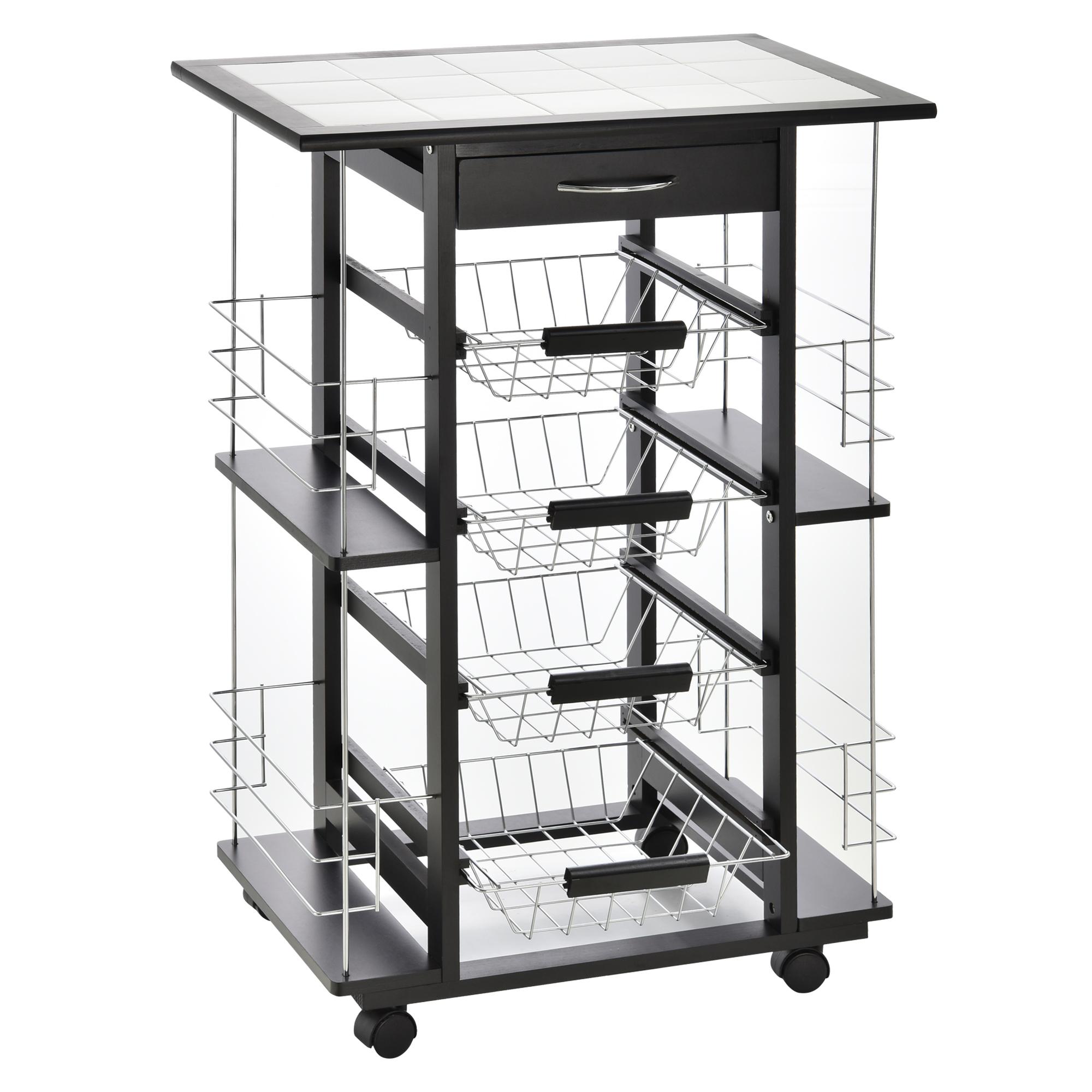 Chariot de service desserte de cuisine à roulettes multi-rangements 4 paniers métal tiroir + 4 range-bouteilles bois pin noir plateau carrelé blanc