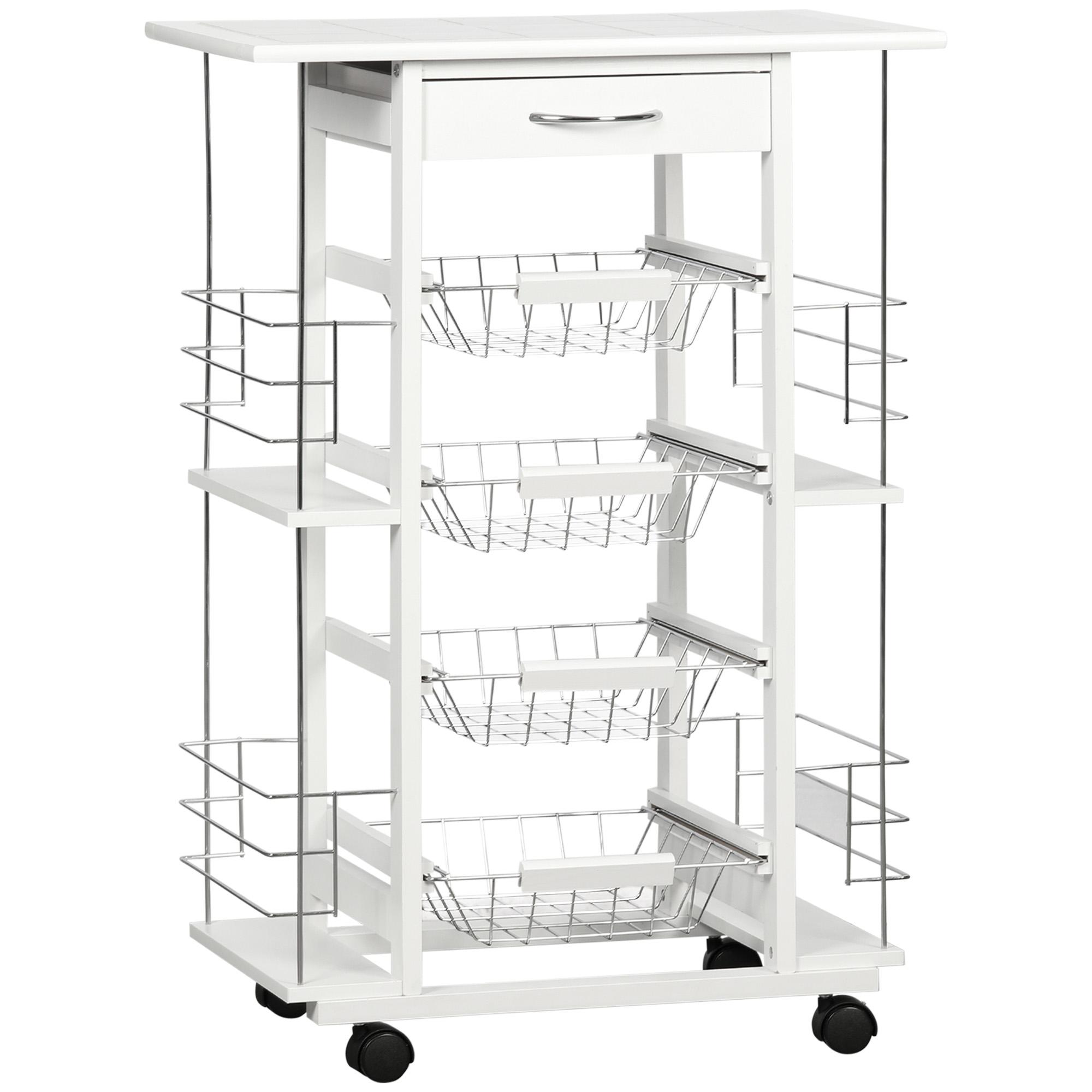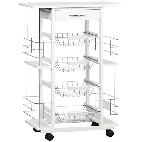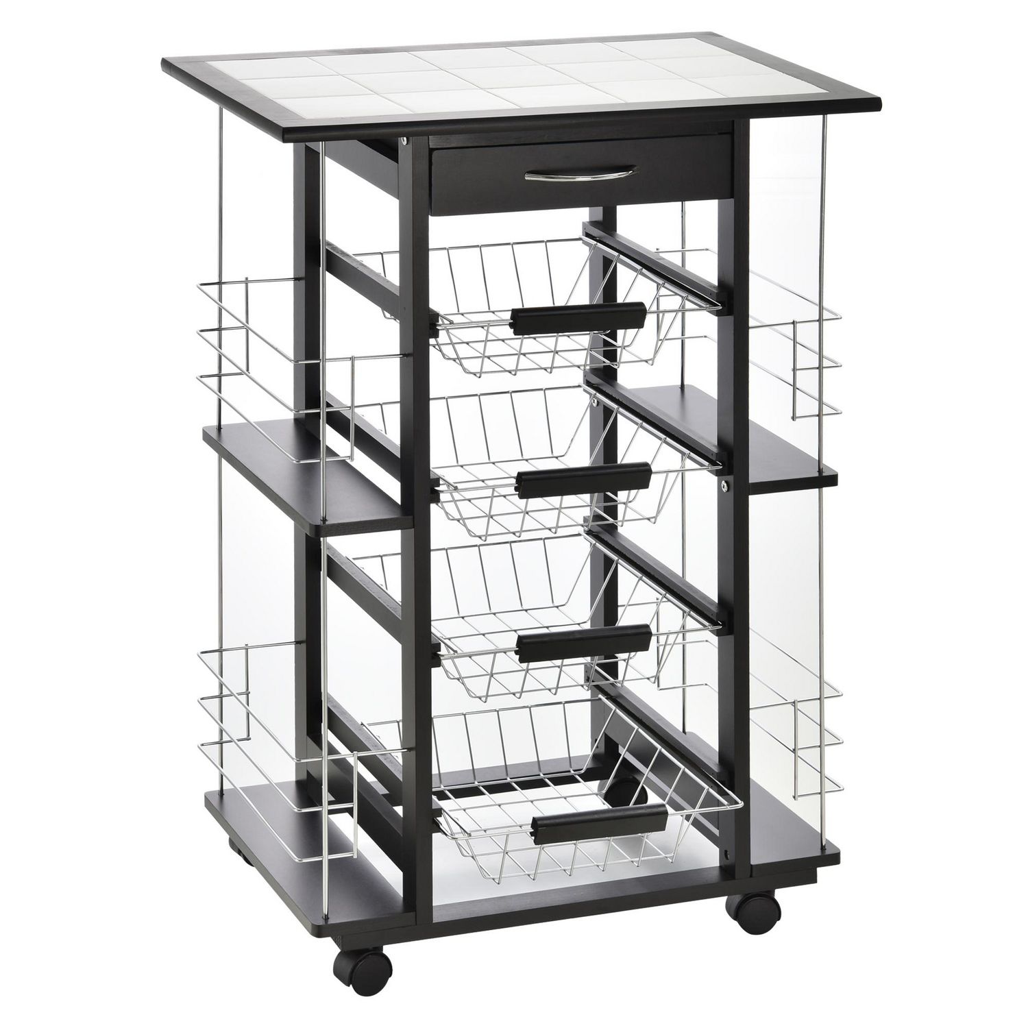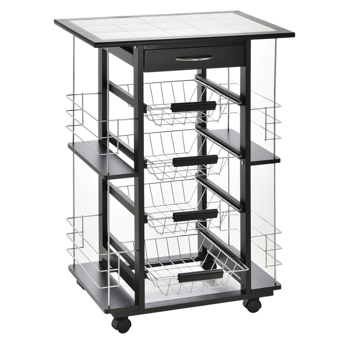 - Desserte multi-rangements : 4 paniers étagères métallique coulissants, idéal pour ranger vos fruits, légumes et bien d'autres encore + plateau plan de travail carrelé + tiroir + 4 range-bouteilles