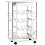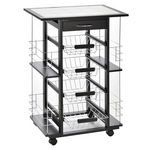 Chariot de service desserte de cuisine à roulettes multi-rangements 4 paniers métal tiroir + 4 range-bouteilles bois pin plateau carrelé