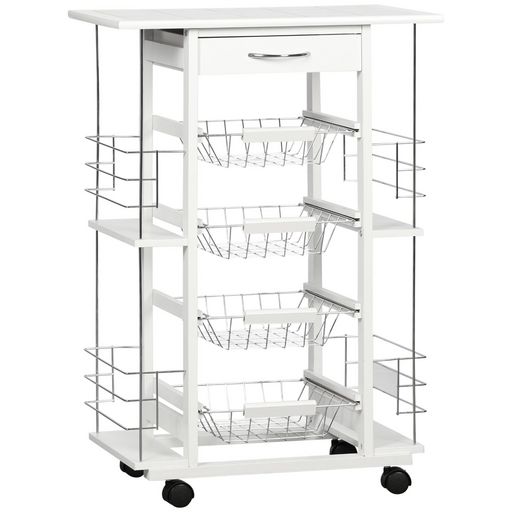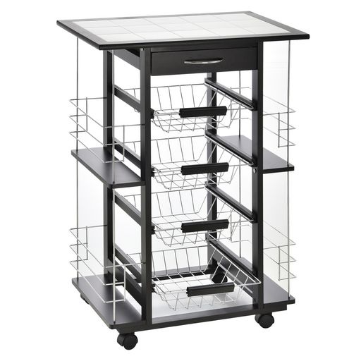 Cette superbe desserte de service multi-rangements sur roulettes vous facilitera grandement la vie ! Équipé de 4 paniers, d'un tiroir, de 4 espaces range-bouteilles et d'un plateau/plan de travail carrelé, vous pourrez ranger vos fruits, légumes et bien d'autres encore. Quoi de plus pratique ?