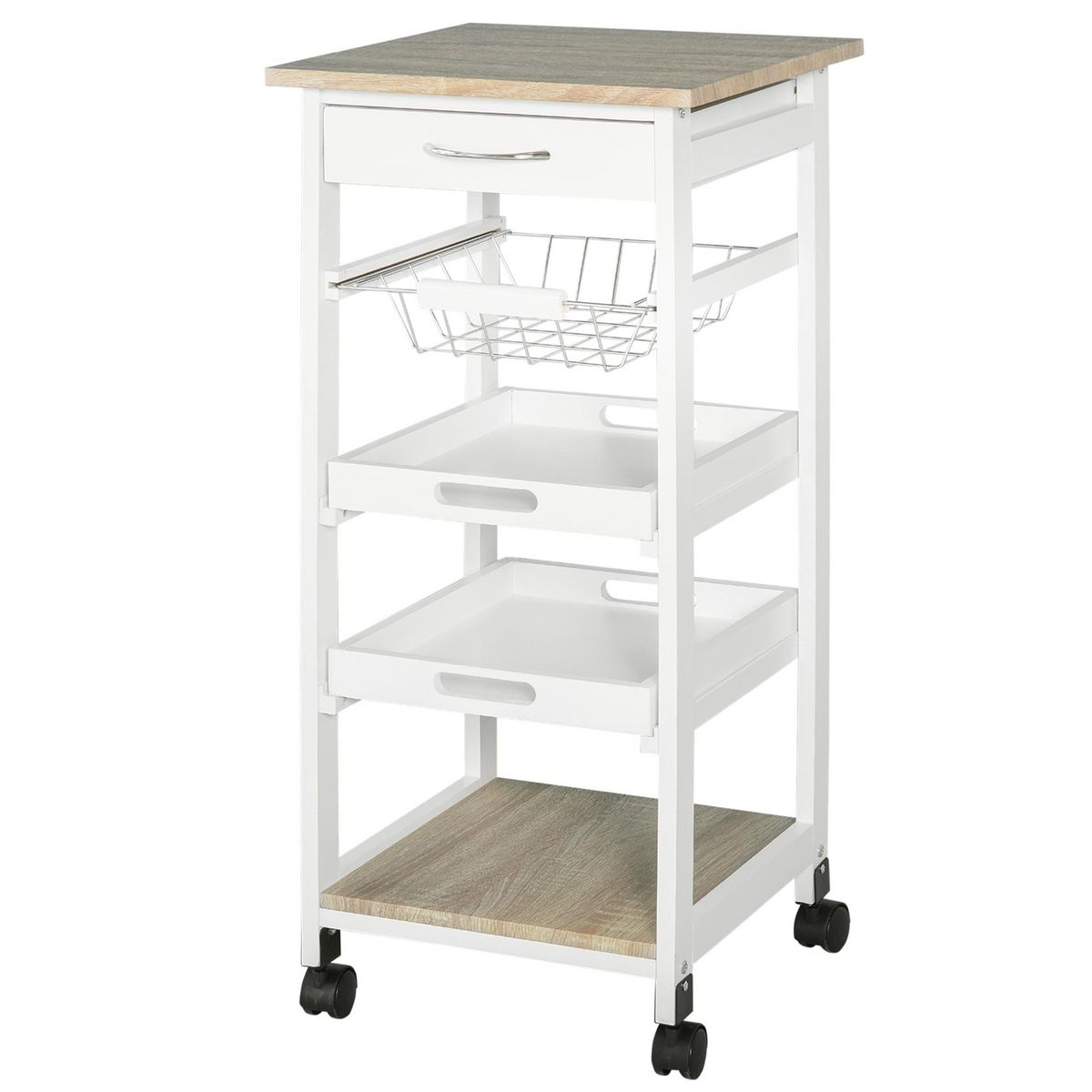 - Desserte multi-rangements : panier + 2 plateaux amovibles, tiroir, étagère + plateau supérieur/plan de travail
