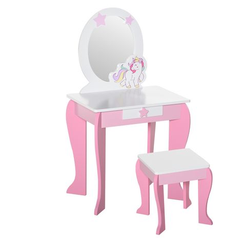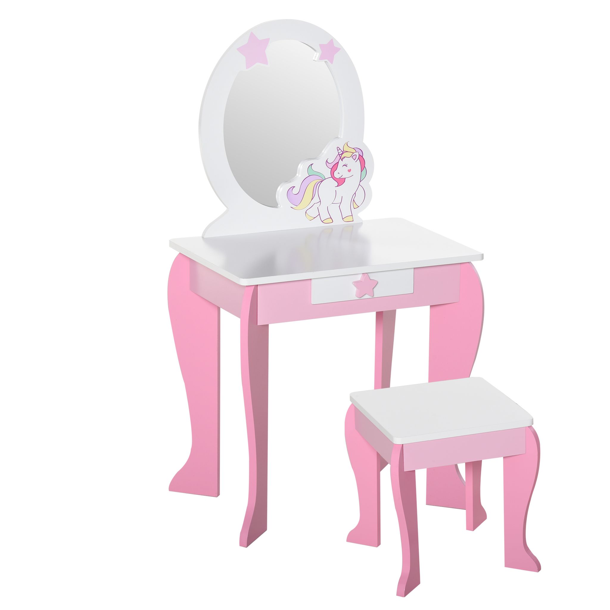 Coiffeuse enfant design licorne - tabouret inclus - dim. 49L x 34l x 90H cm - tiroir, miroir - MDF - rose blanc