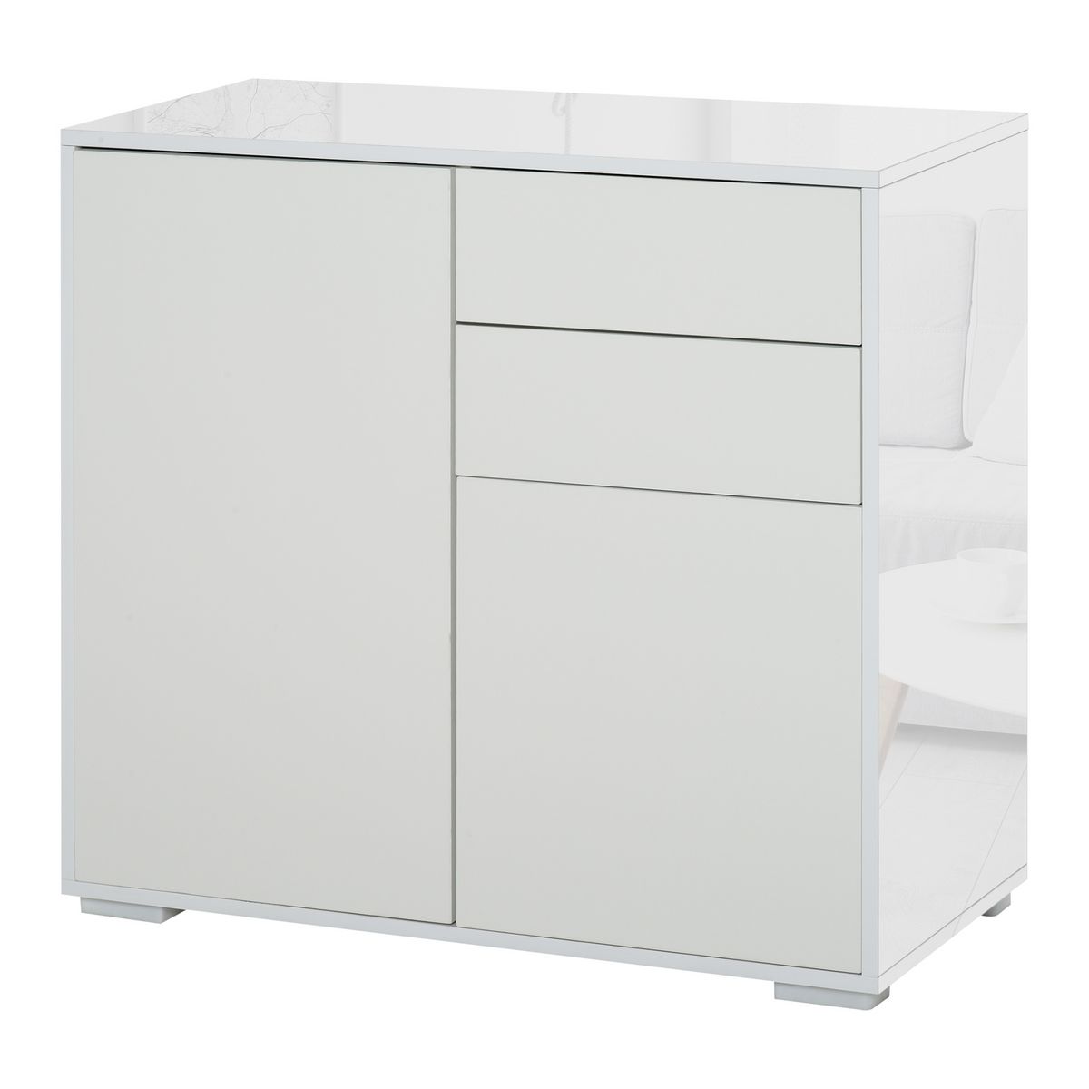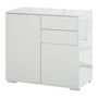 En savoir +Ce meuble de rangement est à la fois pratique et élégant ! 2 tiroirs coulissants et 2 placards porte avec étagère réglable en hauteur vous offrent un grand espace de rangement. Son design contemporain épuré blanc laqué et gris imitation bois apportera une touche particulière à l'espace intérieur de votre choix : salon, chambre, bureau, entrée.