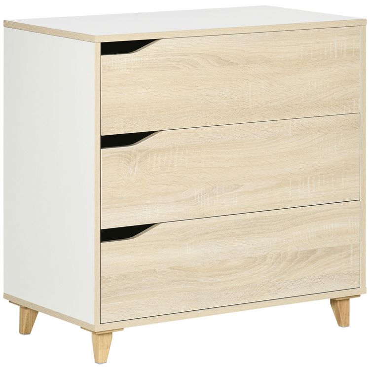 Commode design scandinave 3 tiroirs piètement effilé panneaux MDF blanc aspect bois clair