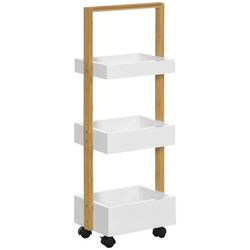 Cette jolie desserte de cuisine ou salle de bain dotée de 3 compartiments deviendra rapidement indispensable et très utile !Caractéristiques :- Chariot desserte de cuisine ou salle de bain sur roulettes pratique et élégant- Desserte bicolore blanc et bois de bambou : touche de raffinement supplément