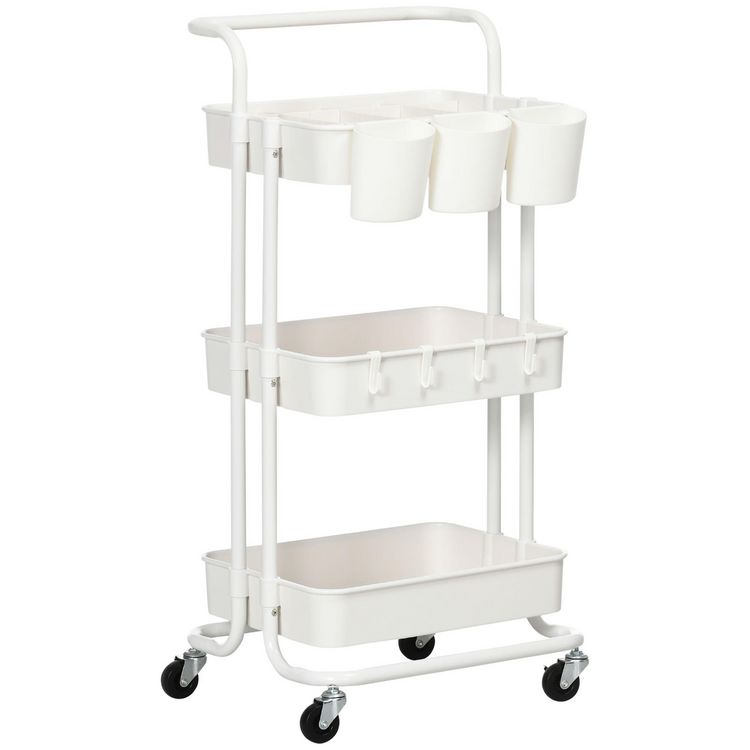 Ce superbe chariot de service à roulettes multi-rangement vous facilitera grandement la vie ! Équipé de 3 étagères avec rebord, 3 pots suspendus et 4 crochets, vous pourrez ranger vos fruits, légumes et bien d'autres encore. Quoi de plus pratique ?