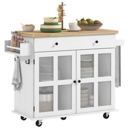 Transformez votre cuisine avec le chariot îlot HOMCOM. Son large plateau en bois d'hévéa de 95 x 46,3 cm offre un espace de travail ou de salle à manger supplémentaire. Profitez d'un tiroir pratique, de 2 armoires et d'étagères réglables pour une organisation optimale. Ce chariot moderne, monté sur 5 roues, comprend un porte-épices et un porte-torchons, apportant commodité et mobilité à votre espace.