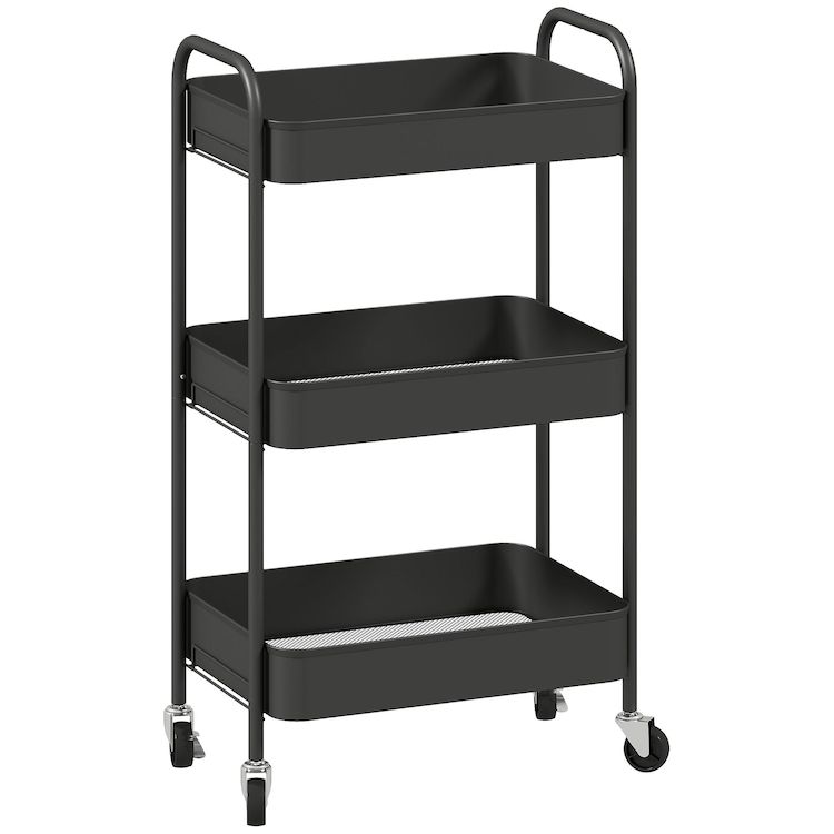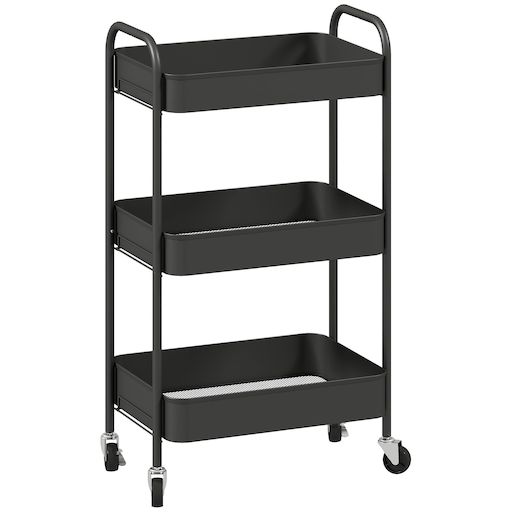 En savoir +Ce superbe chariot de service à roulettes multi-rangements vous facilitera grandement la vie ! Équipé de 3 plateaux en métal ajouré vous permet de ranger aussi bien des produits de cuisine, des articles de salle de bain ou pour la chambre des enfants. Les 4 roulettes et les poignées permettent de la déplacer très facilement. Quoi de plus pratique ?