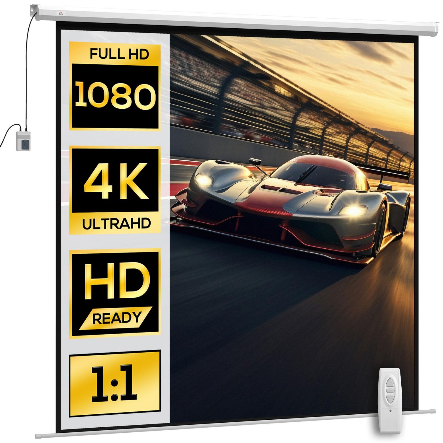 Écran de projection motorisé home-cinéma format 1:1 120 pouces 4K HD avec télécommande blanc noir