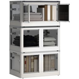 Ensemble de 3 boîtes de rangement 69L pliables empilables - couvercle, roulettes - blanc gris