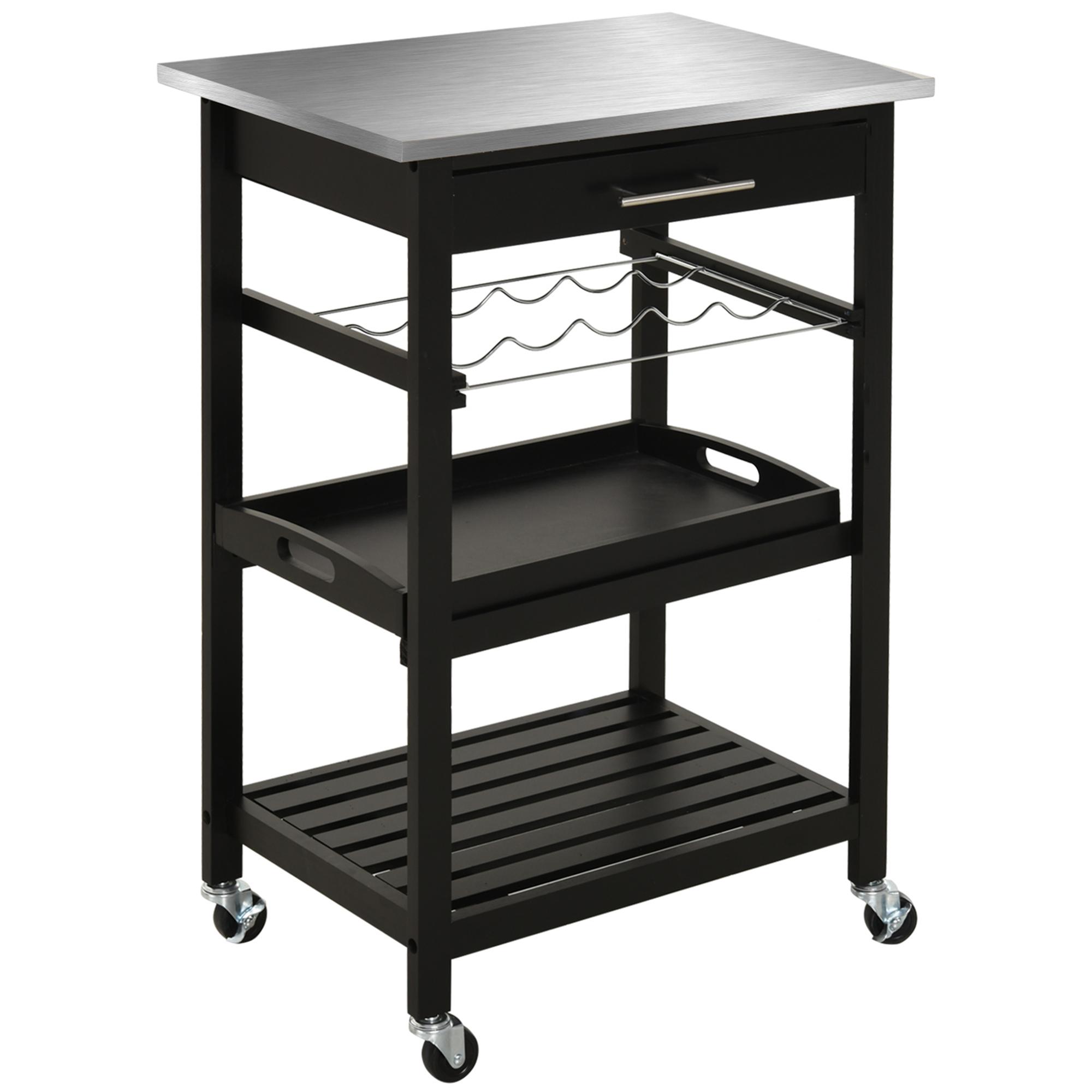 HOMCOM Chariot de service desserte de cuisine à roulettes multi-rangements 60L x 40l x 85H cm plateau acier inox. MDF pin noir