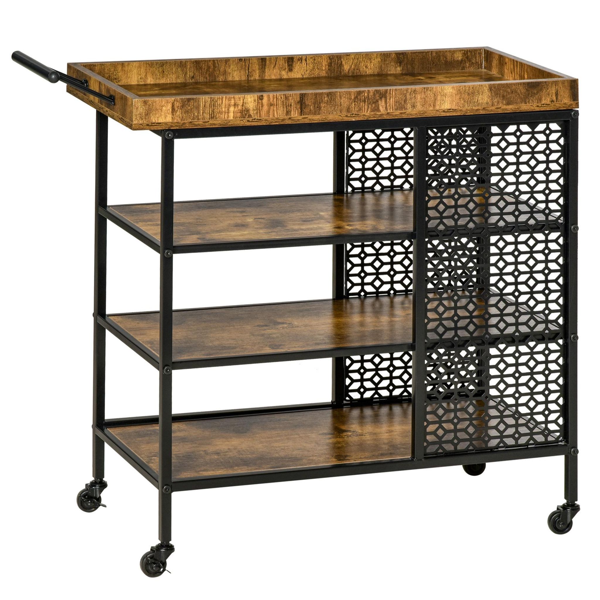 HOMCOM Desserte Vintage style industriel - chariot de service 3 étagères et plateau à rebord - châssis métal noir avec parois ajourées et poignée - MDF aspect bois vieilli