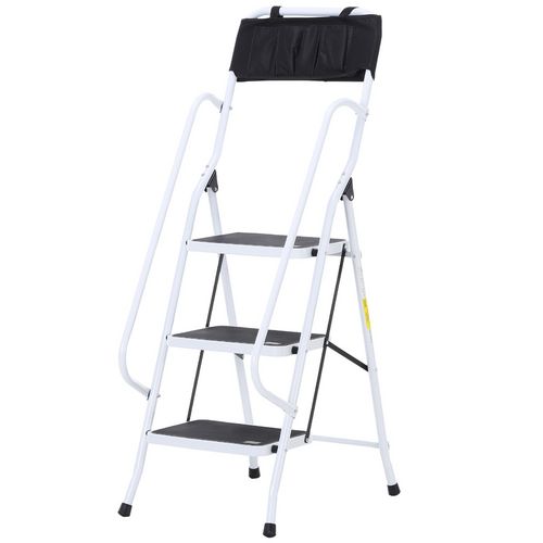 HOMCOM Escabeau pliable 3 marches XL antidérapantes double garde corps hauteur max. 1,31 m charge max. 150 Kg pochette outils intégrée acier blanc noir
