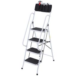HOMCOM Escabeau pliable 4 marches XL antidérapantes double garde corps hauteur max. 1,55 m charge max. 150 Kg pochette outils intégrée acier blanc noir