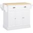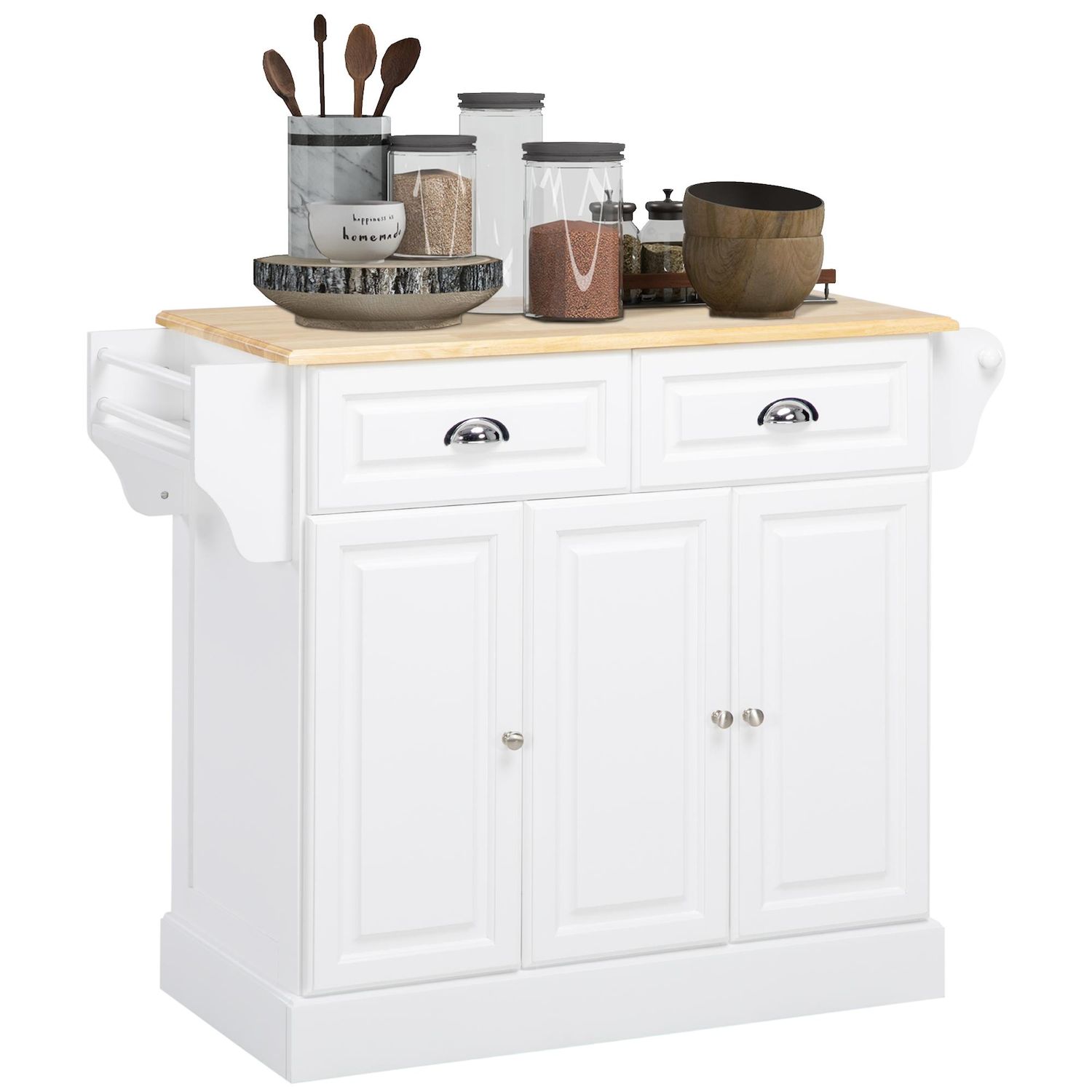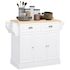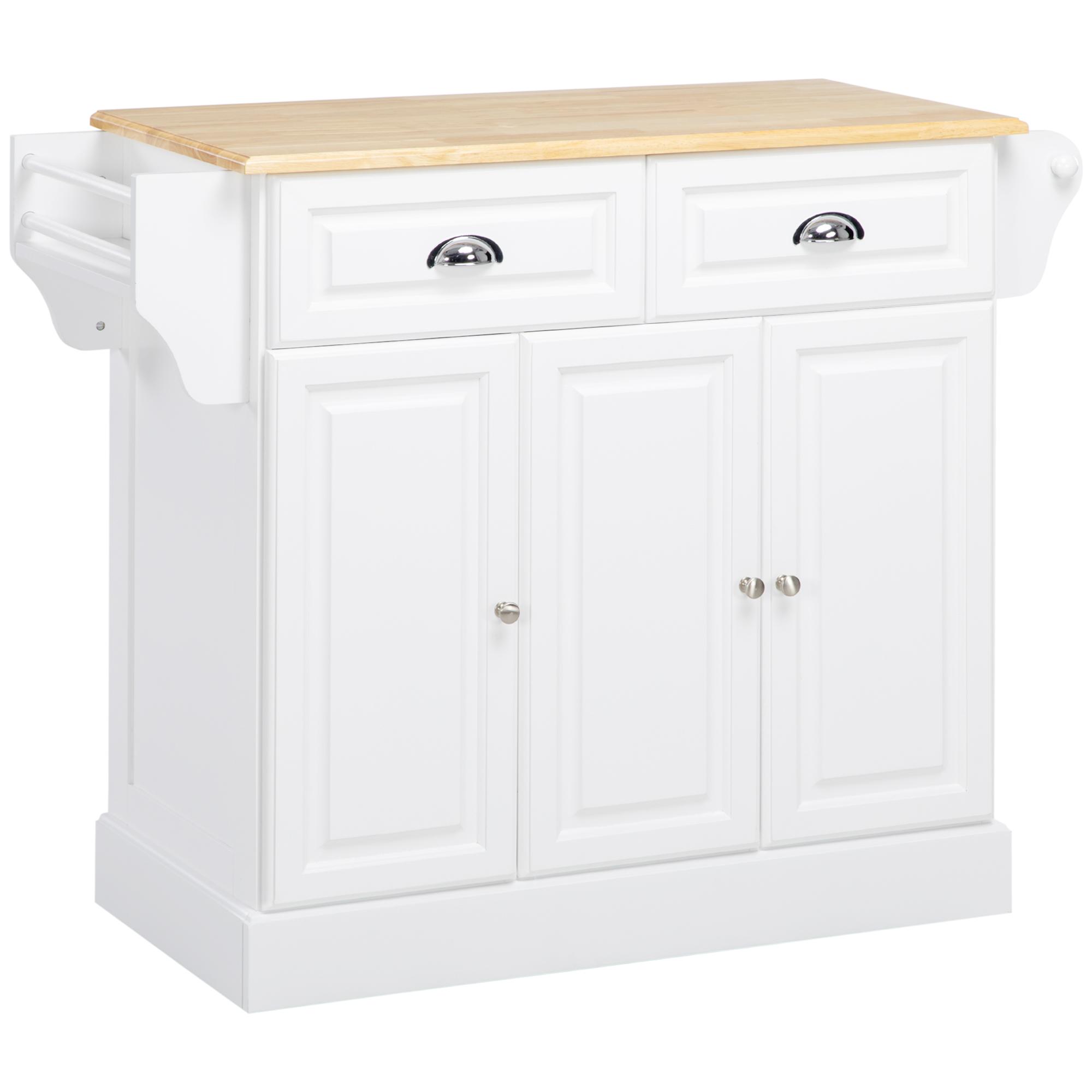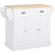 Îlot de cuisine desserte à roulettes - 2 tiroirs, 3 portes, porte-serviette, porte-épices - dim. 110L x 45l x 91H cm - blanc bois