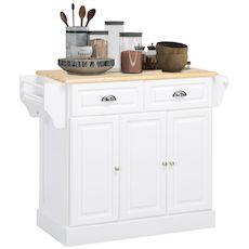 En savoir +Cet îlot de cuisine HOMCOM a un design parfait pour s'adapter à tous les styles de décoration. Il est équipé de 2 tiroirs, de placards avec étagères réglables, d'une étagère à épices et d'un rail de suspension, où vous pouvez ranger tous vos ustensiles et fournitures de cuisine. Grâce à ses roulettes, vous pouvez le déplacer facilement de la cuisine à la salle à manger et inversement.