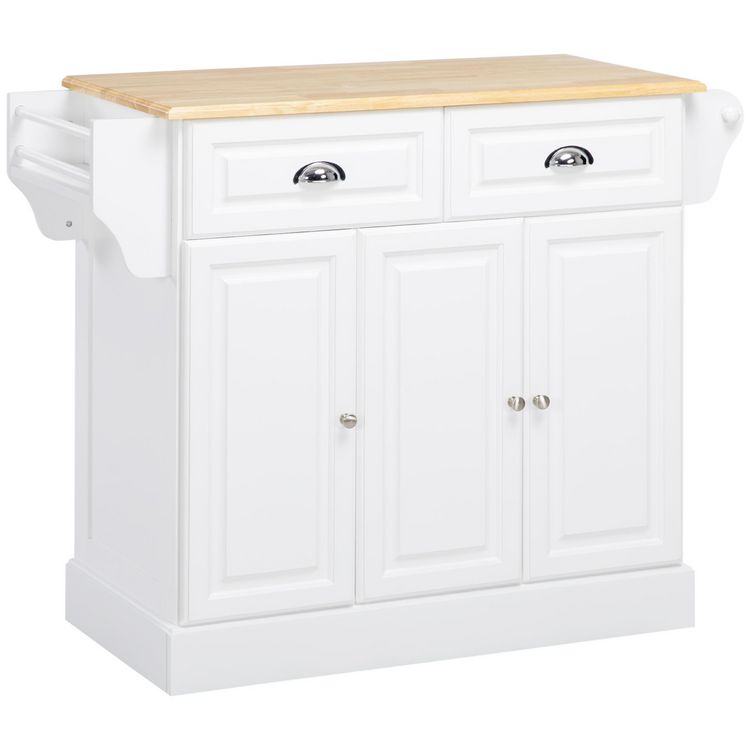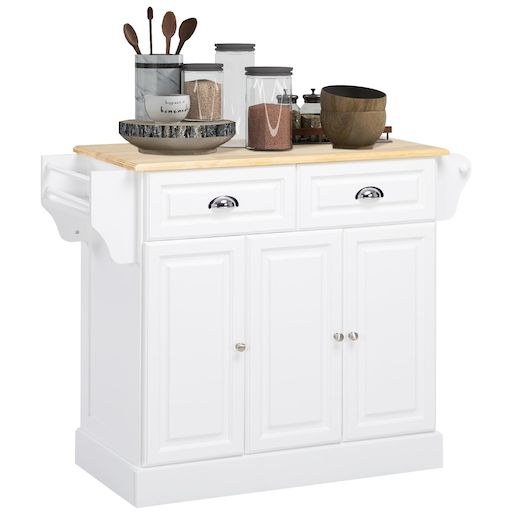 Cet îlot de cuisine HOMCOM a un design parfait pour s'adapter à tous les styles de décoration. Il est équipé de 2 tiroirs, de placards avec étagères réglables, d'une étagère à épices et d'un rail de suspension, où vous pouvez ranger tous vos ustensiles et fournitures de cuisine. Grâce à ses roulette
