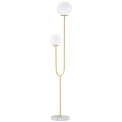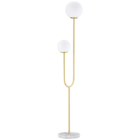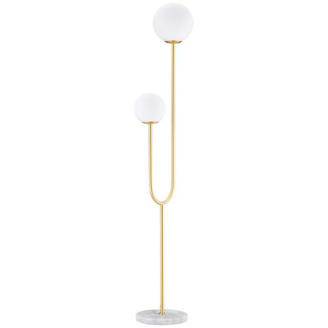 Simple, élégant et pratique, ce lampadaire possède un pied en métal fin et raffiné, une base ronde aspect marbre stable et deux abat-jours globes en verre dépoli qui tamisera naturellement l'intensité lumineuse. Son pied haut à la finition métallisée dorée ajoutera une pointe d'élégance dans votre d