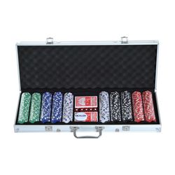 - Mallette complète comprenant 500 jetons de 5 couleurs différentes, 2 jeux de carte, 5 dés, 1 bouton dealer et 2 clés