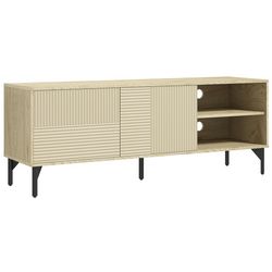 Meuble TV banc TV design Urban Craft - 2 portes, 2 étagères, 2 niches - piètement acier noir - aspect chêne clair
