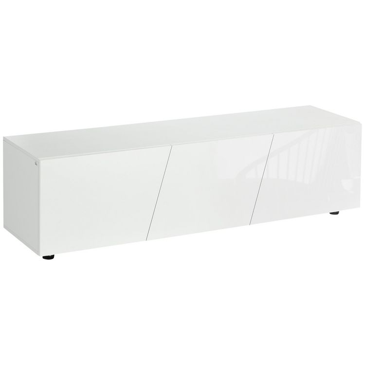 Ce joli meuble TV style épuré contemporain blanc laqué ajoutera une touche supplémentaire d'élégance et modernité à votre intérieur. Equipé de 3 placards avec porte abattante (chacun doté d'une étagère), de 2 compartiments (2 passe-fils intégrés) et d'un grand plateau, vous pourrez aisément ranger t