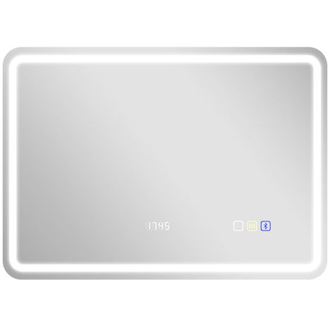 Miroir lumineux LED salle de bain Bluetooth 50x70cm - horloge numérique, antibuée, tactile, réglable - verre trempé 4 mm