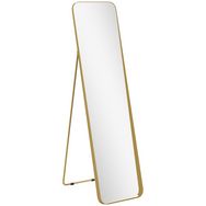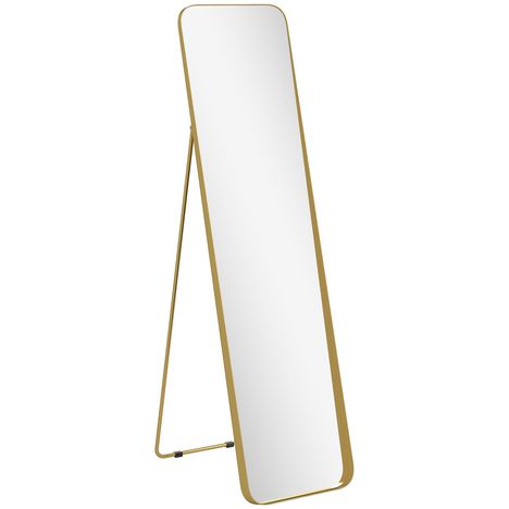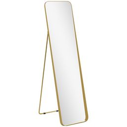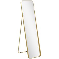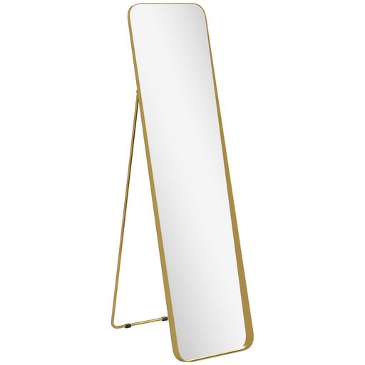 Explorez votre reflet avec le miroir sur pied HOMCOM. Inclinable, disponible pour montage mural ou au sol, il apporte une touche élégante à tout espace. Avec ses coins arrondis et son cadre doré, il sublime toute chambre ou dressing. Le verre haute définition incassable assure sécurité et clarté.Car