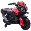 Moto électrique enfant 6 V 3 Km/h effet lumineux et sonore roulettes amovibles repose-pied valises latérales métal PP rouge noir