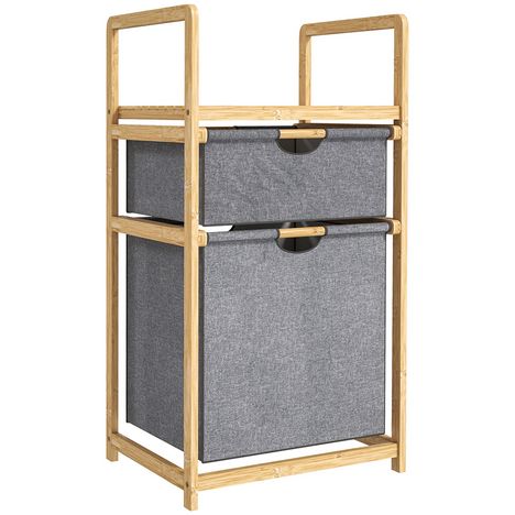 Panier à linge en bambou - panier à linge 2 bacs et étagère - panier à linge double - tissu gris