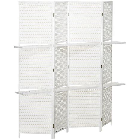 Paravent intérieur 4 panneaux 2 étagères pliables séparateur de pièce bois de pin bambou fibres de papier tressée blanc paille