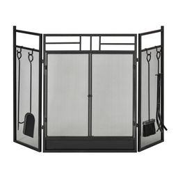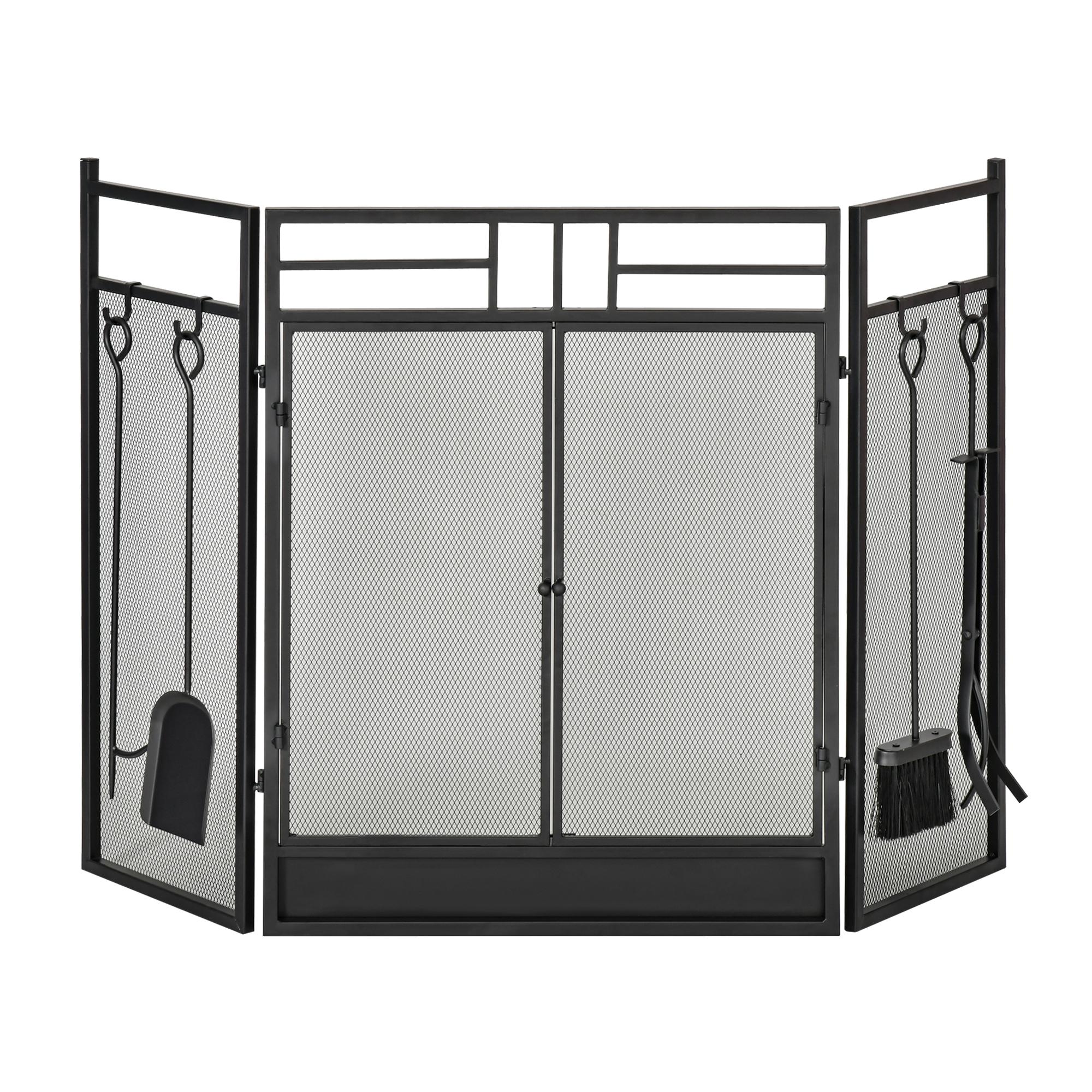 Pare-feu large pour cheminée ou poêle - pare-étincelles serviteur de cheminée 2 en 1 avec accessoires - 3 volets pliables et porte - acier métal noir