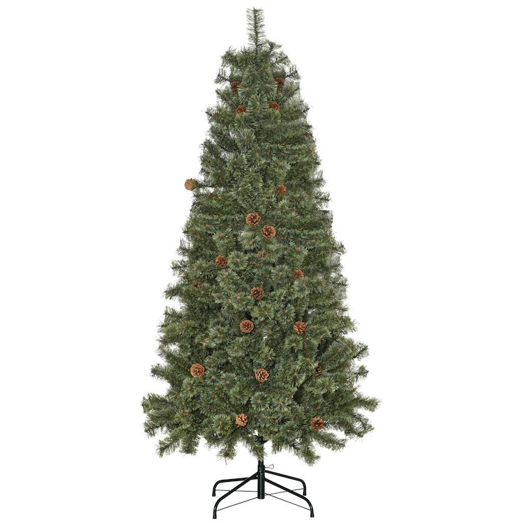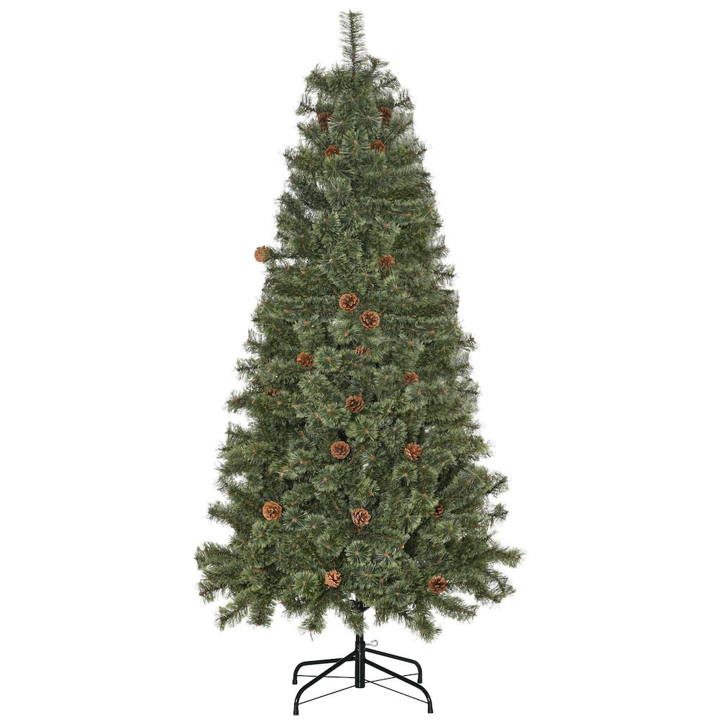 Sapin de Noël artificiel Ø 87 x 180H cm - 450 branches épines imitation Nordmann grand réalisme - 28 pommes de pin - métal PVC vert