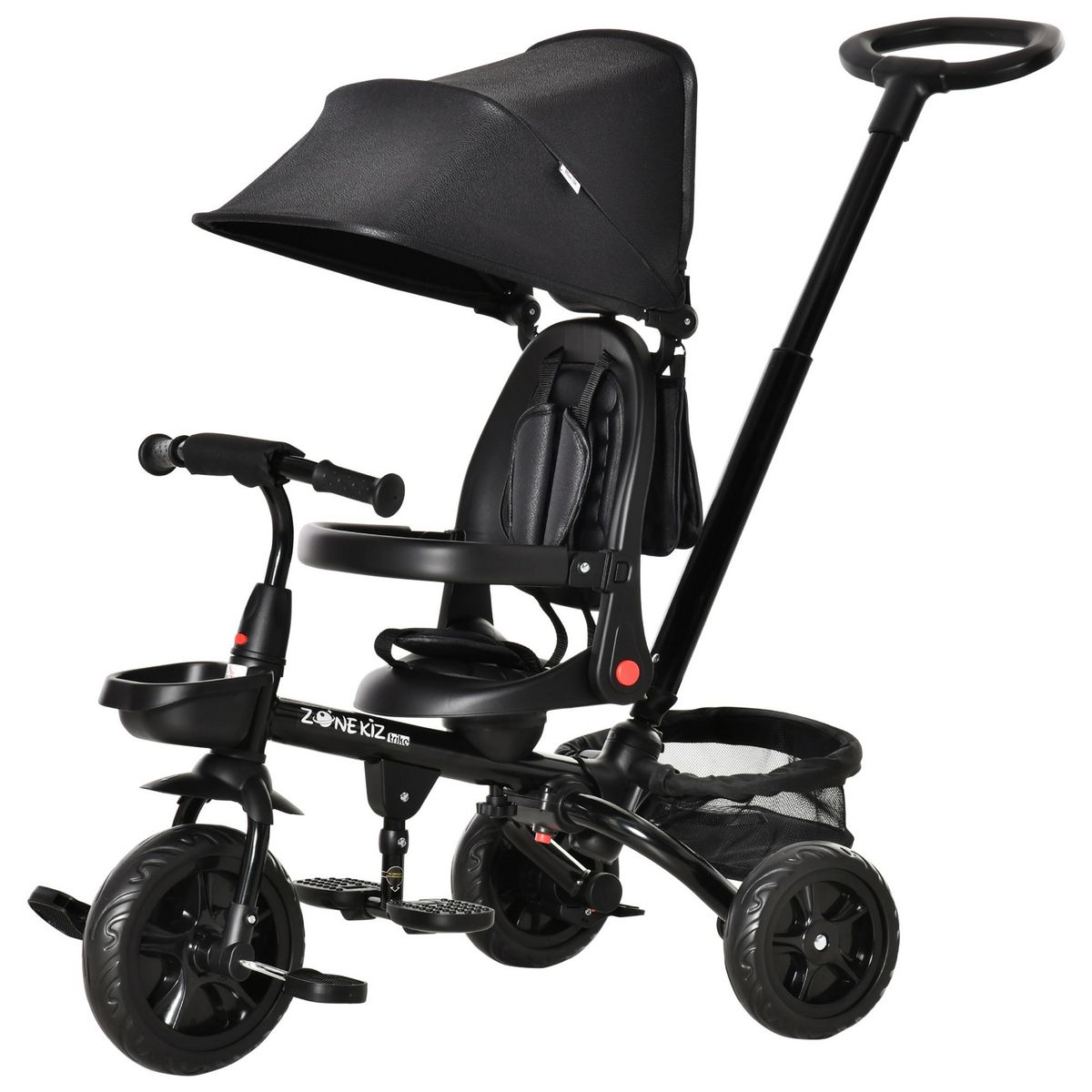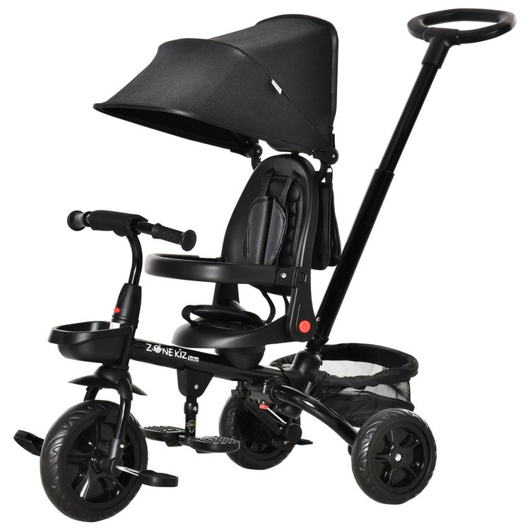 Tricycle enfant évolutif pliable 4 en 1 multifonction - pare-soleil, canne télescopique amovible - siège pivotant, harnais, arceau sécurité - 3 paniers rangement - métal PP noir