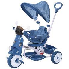 Ce magnifique tricycle évolutif et ludique imitation scooter fera la joie de votre bambin ! Multi-equipé, doté d'une canne amovible, d'un arceau de sécurité, de pédales antidérapantes, d'un panier de rangement, etc... vos balades au parc ou au marché seront plus animées ! Caractéristiques : - Tric