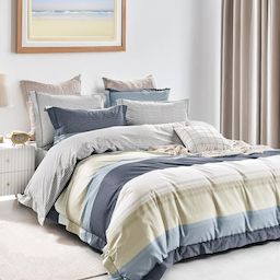 PARURE HOUSSE DE COUETTE 100 % COTON AVEC TAIE(S) A VOLANT LAYERAApportez un souffle frais et contemporain à votre chambre avec la parure de couette Ondalya. Son motif bayadère horizontal aux nuances bleu clair, bleu foncé, beige et blanc crée un effet graphique harmonieux et apaisant, parfait pour
