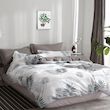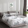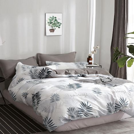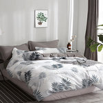 PARURE HOUSSE DE COUETTE 100 % COTON AVEC TAIE(S) A VOLANT LIBFULApportez une touche de nature stylisée et de légèreté à votre chambre avec la parure de couette Life is beautiful (Libful). Son fond blanc uni met en valeur des feuilles de palmier éparses, dessinées avec élégance dans des tons gris bl