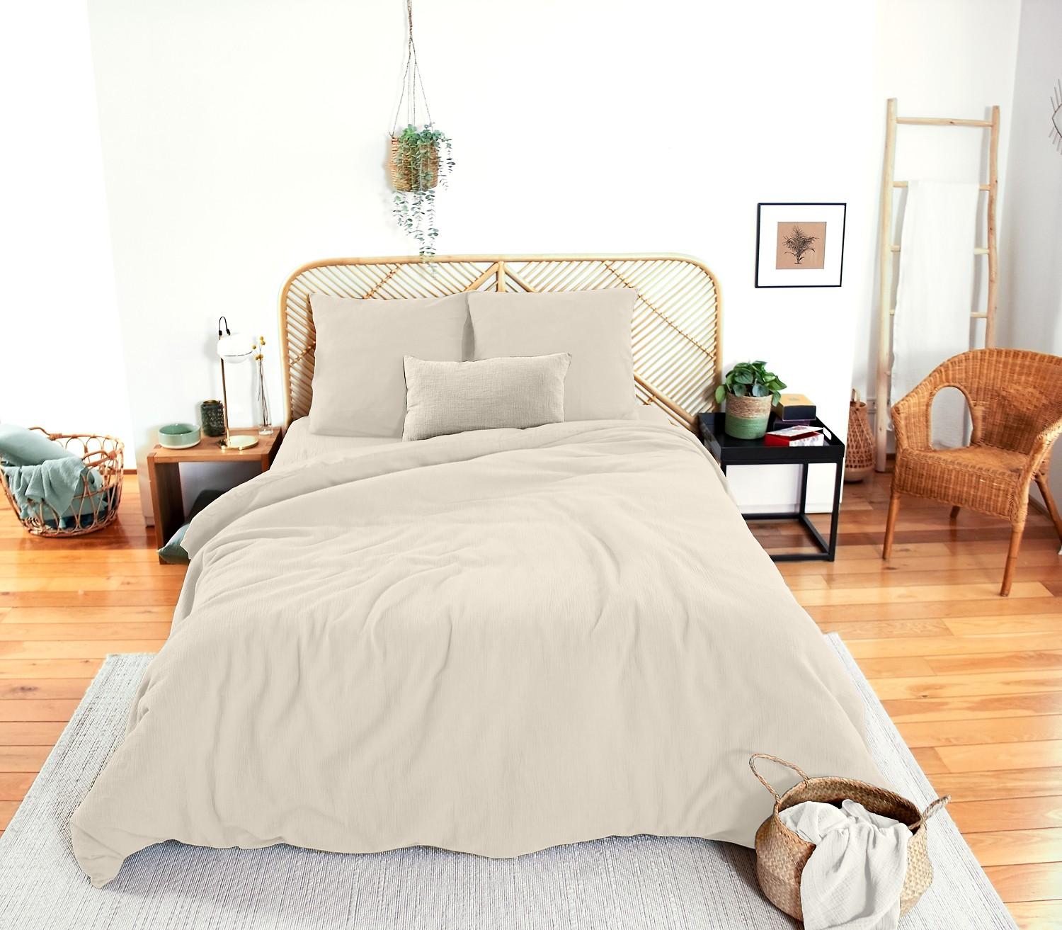 Parure housse de couette bi-matière en coton 57fils et gaze de coton. Ultra douce, elle offre un bel aspect gaufré, moelleux à souhait. Avec son côté naturellement souple et léger.