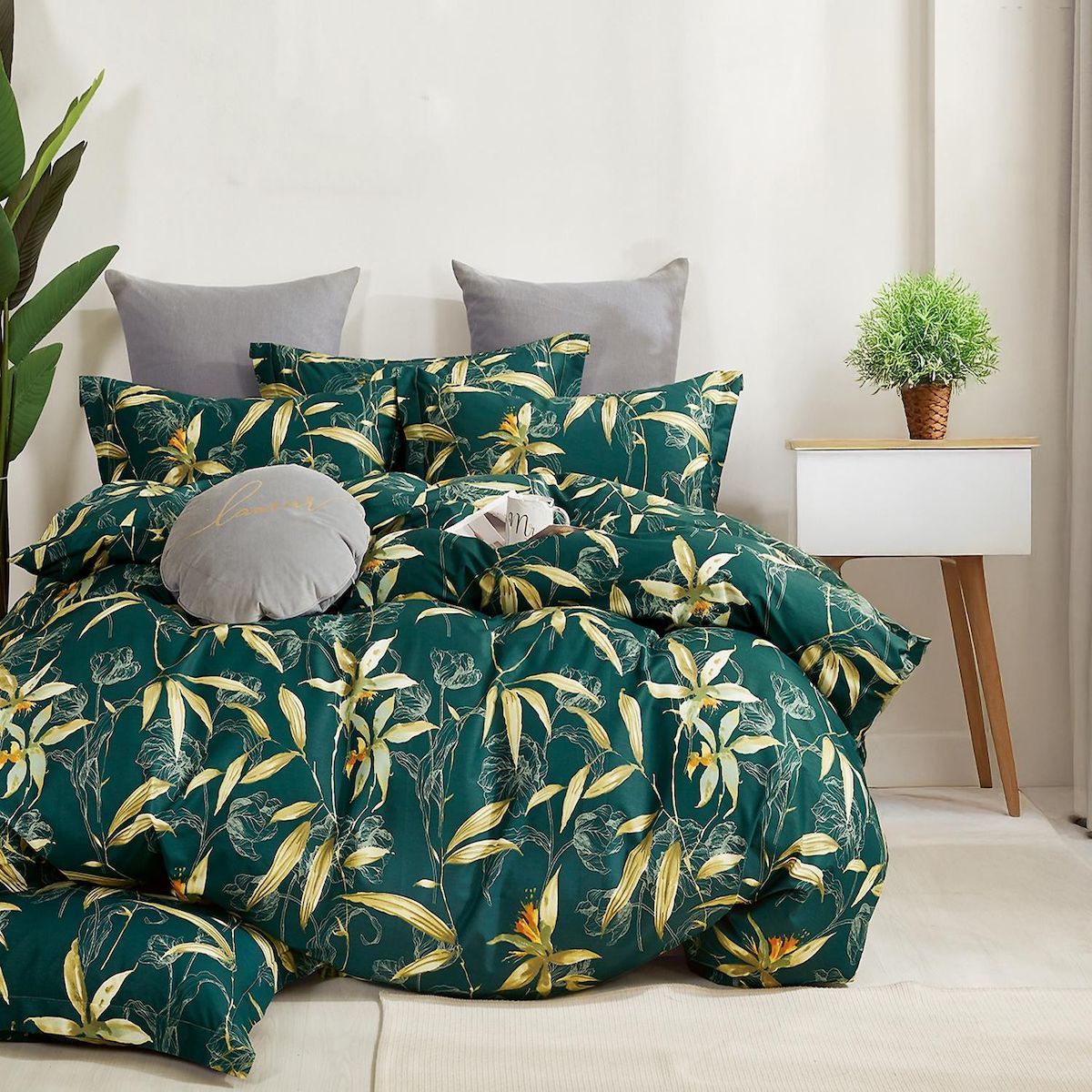 Plongez votre chambre dans une ambiance exotique et élégante avec la parure Bambusia, confectionnée en 100% percale de coton au tissage fin de 80 fils/cm². Son motif luxuriant de feuilles dorées et vert clair sur un fond vert profond crée une atmosphère chaleureuse, naturelle et raffinée.