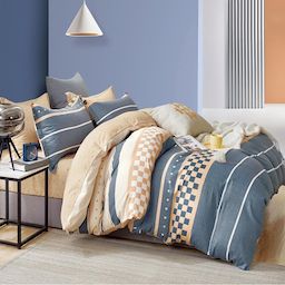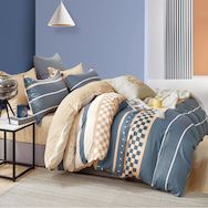 PARURE HOUSSE DE COUETTE 100 % PERCALE DE COTON AVEC TAIES RAYVANApportez une touche moderne et graphique à votre chambre avec la parure Rayvan, réalisée en 100% percale de coton au tissage serré de 80 fils/cm². Ses bandes contrastées, mêlant bleu ardoise, beige sable et motifs géométriques, créent