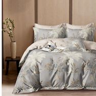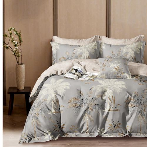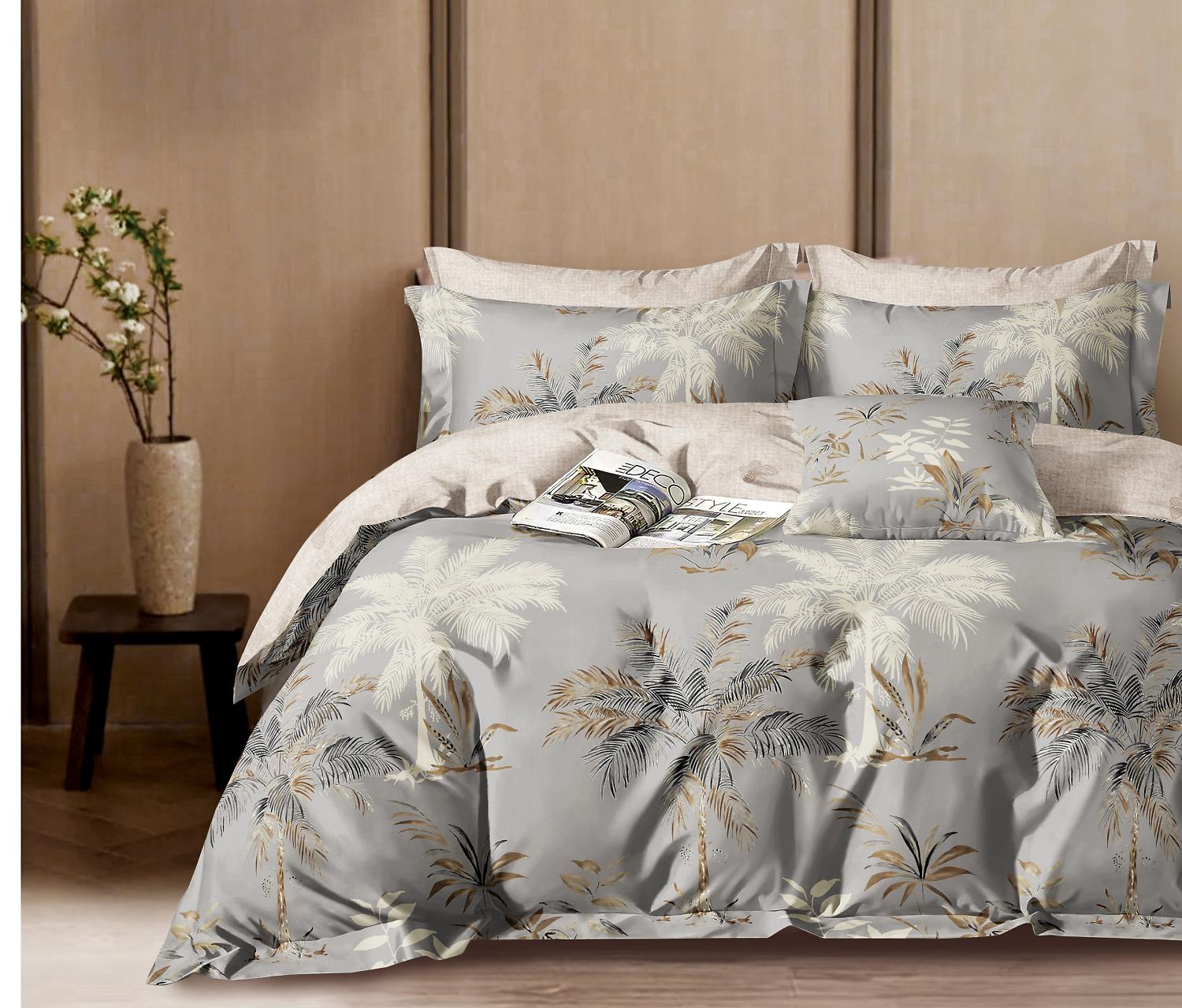 Plongez dans une ambiance apaisante et élégante avec la parure Sélénore, qui revisite le thème tropical dans une version douce, moderne et raffinée. Les palmes finement illustrées se déclinent en nuances sable, crème et anthracite sur un fond gris perle, offrant un rendu harmonieux et très chic.