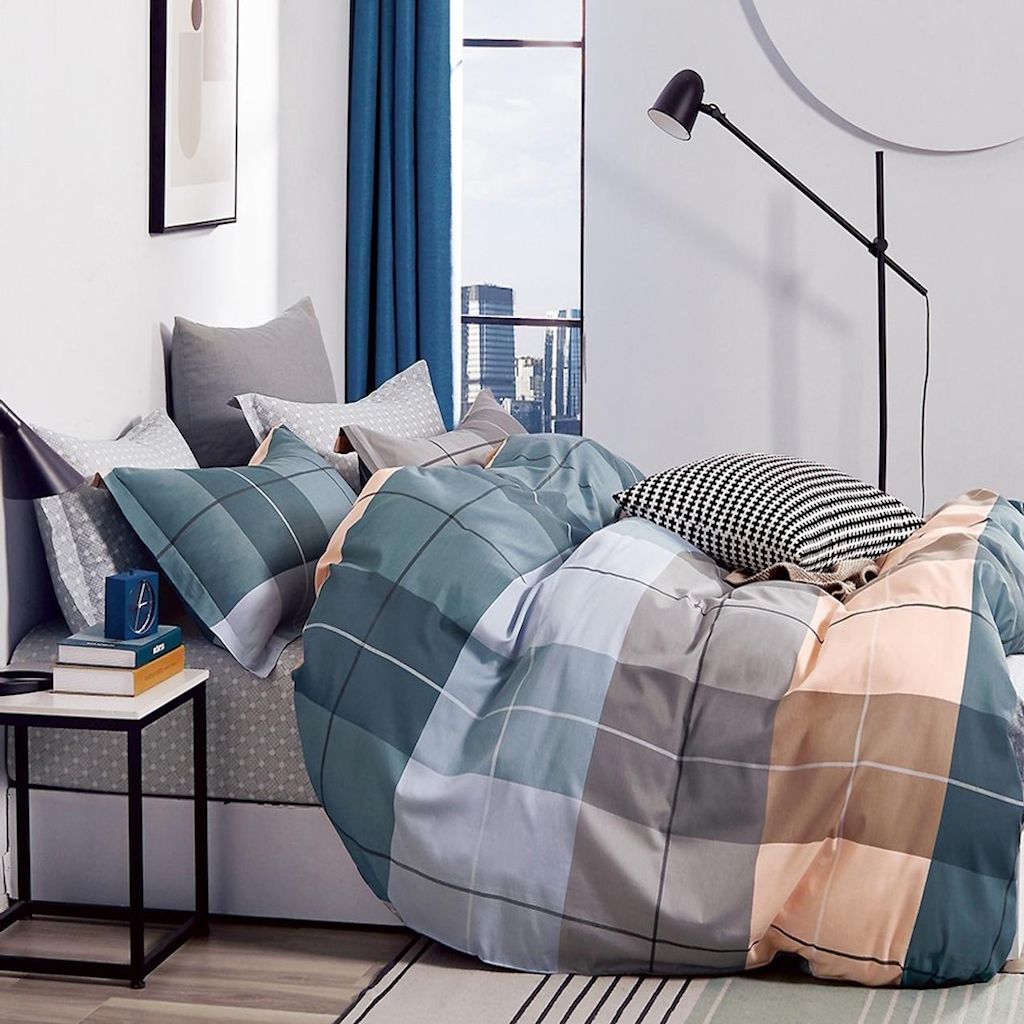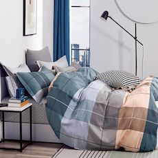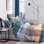 PARURE HOUSSE DE COUETTE 100 % PERCALE DE COTON AVEC TAIES URBANOffrez à votre chambre une touche moderne et élégante avec cette parure en percale de coton 100% naturelle, tissée en 80 fils/cm². Son motif à larges carreaux dans des tons apaisants de bleu, vert, gris et beige apporte une ambiance dou