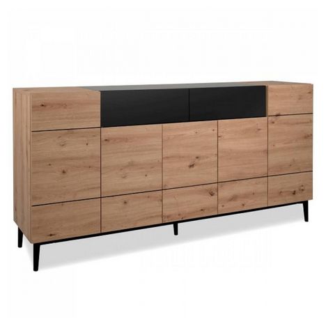 Découvrez notre Buffet Commode en Bois de Chêne Noir Naturel, un meuble de salon alliant modernité et fonctionnalité. Avec ses 12 compartiments et 2 tiroirs coulissants, il offre un espace de rangement généreux pour votre salon, salle à manger ou chambre. Ses 4 pieds coniques robustes assurent une s