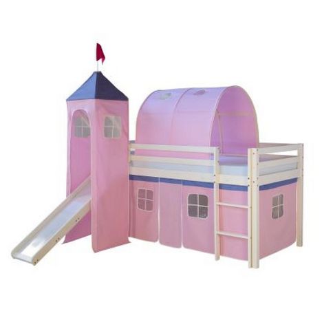 Avec ce produit, vos enfants peuvent vivre des aventures imaginatives pendant la journée et dormir paisiblement la nuit. Pour éviter le danger en grimpant et sautant autour, les bords du lit sont arrondis qui permet une protection et empêche vos enfants de tomber. L´échelle peut être monté sur les deux côtés, de sorte que le lit est flexible vos conditions spatiales. Dimensions Superficie (L x P): 90 x 200 cm Dimensions extérieures (W / H / P): 207 x 150 x 97 cm Hauteur de Tête du lit et le bois de pin: 112 cm Profondeur du planché des matelas 4 cm Epaisseur Post: 40mm Épaisseur: 20 mm Sommier inclus