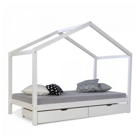 Details lit: grand lit en forme de maison 90 x 200 cm couleur blanc incluant un cadre à lattes enroulables, matelas et 2 tiroirs de lit coulissants pour plus d´espace de rangement construction solide en bois massif à 100 % et fabrication de haute qualité poteaux et bords arrondis faciles à monter le linge de lit, le matelas et la décoration ne sont pas inclus dans la livraison Details matelas: matelas pour lits d'enfants 90 x 200 cm blanc adapté au plan de couchage : 90x200 cm épaisseur totale du matelas pour jeunes : 12 cm degré de dureté 2 résistant et indéformable convient aux personnes allergiques sans FCFC Matériau et Couleur du lit: poteaux en bois de pin massif laqué blanc Dimensions du lit: surface de couchage du lit de jeune (L x L) : 90 x 200 cm lit dimensions extérieures (L/H/P) : 208 x 160 x 96 cm hauteur au bord du lit : 30 cm socle du lit (L/H/P) : 96 x 19 x 62 cm tiroir dimensions intérieures : 86 x 60 cm profondeur d´insertion du matelas : 4 cm epaisseur du poteau : 5 cm d´autres dimensions voir image détaillée Rembourrage du matelas: matelas en mousse confort avec une coupe à âme lisse noyau de mousse de confort : 11 cm PU - mousse de confort 25 kg/m³ Housse de matelas: matériau de la housse : 100 % Polyester couleur: Blanc rembourrage de matelas en microfibre (design 50190-55) matériau de surface matelassé sur les deux faces avec 60 g/m² de fibres climatiques haute capacité portante et régulation de l´humidité présentation: matelassé avec bordure et bordure couverture non déhoussable Sommier inclus