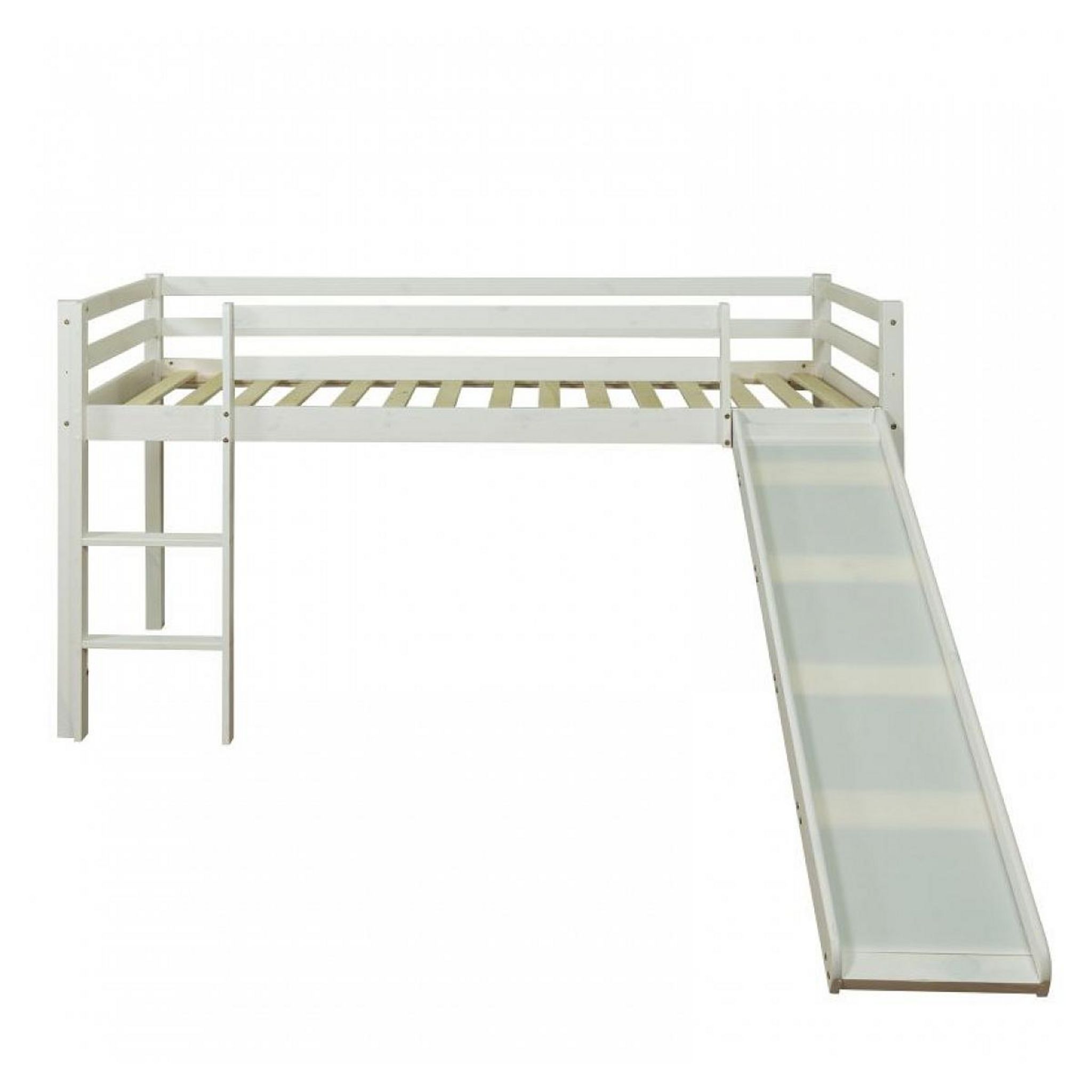 Les lits superposés n'offrent pas seulement plus de place dans la chambre d'enfant, ils font aussi partie des aventures et des jeux imaginaires des enfants. Grâce à la hauteur de 75 cm, il y a beaucoup d'espace de rangement sous le lit stable pour les groupes de sièges ou les jouets. La surface de couchage de notre lit toboggan est de 90x200 cm. Un sommier à lattes altique, qui favorise un sommeil calme et reposant, est inclus. Selon la configuration de la pièce, l'échelle et le toboggan peuvent être montés en alternance. Détails du produit: cadre de lit avec surface de couchage : 90x200 cm sommier à lattes à roulettes de 13 lattes en bois inclus échelle + toboggan pouvant être montés en alternance avec bordure de sécurité (protection contre les chutes) bords et montants arrondis rideau n'est pas compris dans la livraison Dimensions: surface de couchage : 90 x 200 cm